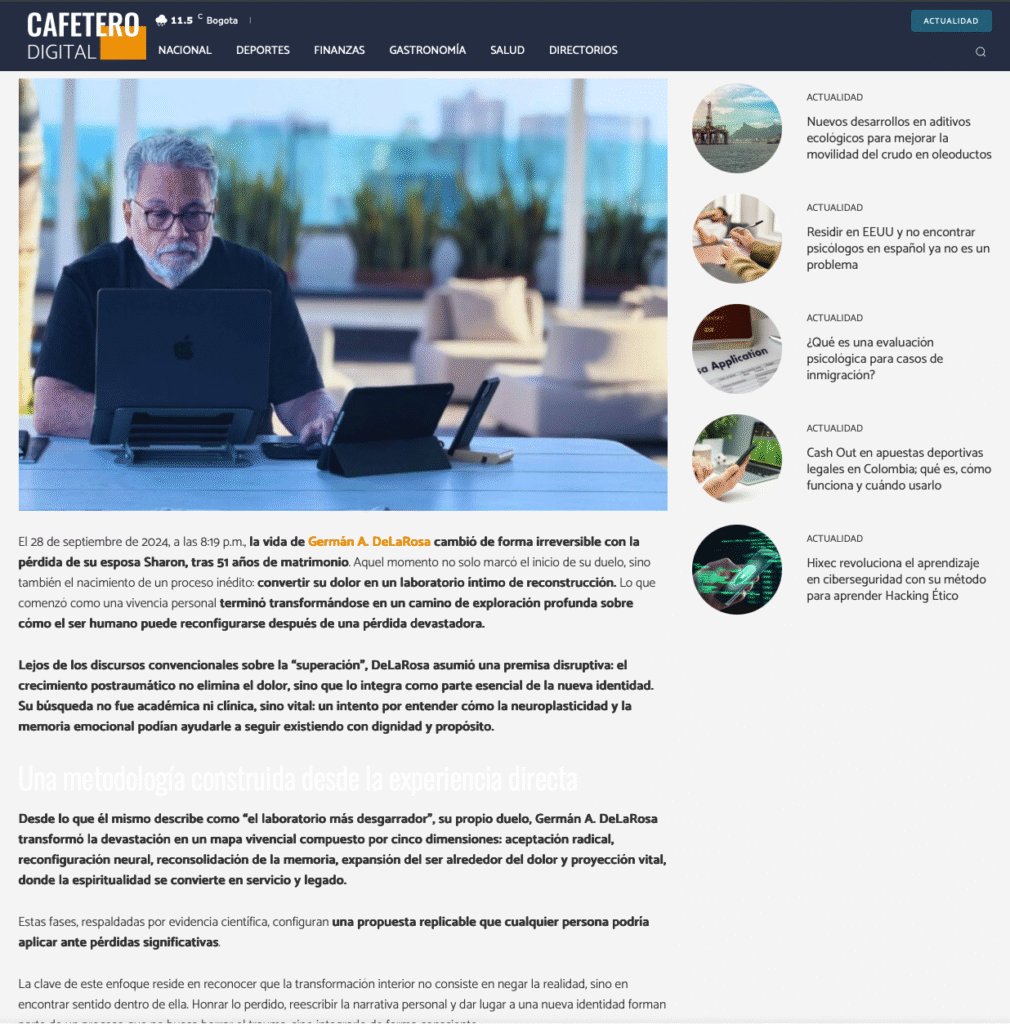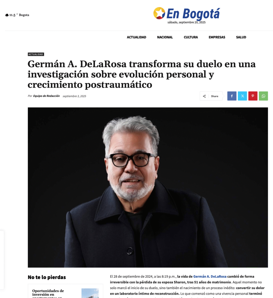 Germán A. DeLaRosa (Barranquilla, Colombia) es escritor y fundador de ProyectoTrípode, una plataforma literaria dedicada a transformar el duelo y la impermanencia en oportunidades de crecimiento humano. Su vida cambió el 28 de septiembre de 2024, con la partida de su esposa Sharon tras 51 años de vida compartida. Ese instante marcó un quiebre irreparable y, al mismo tiempo, el inicio de un camino de reinvención personal y creativa.